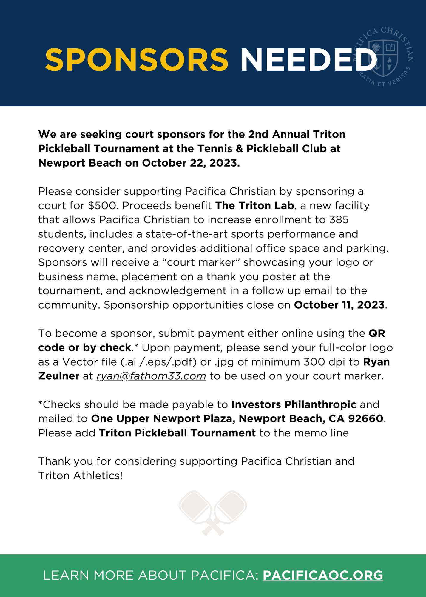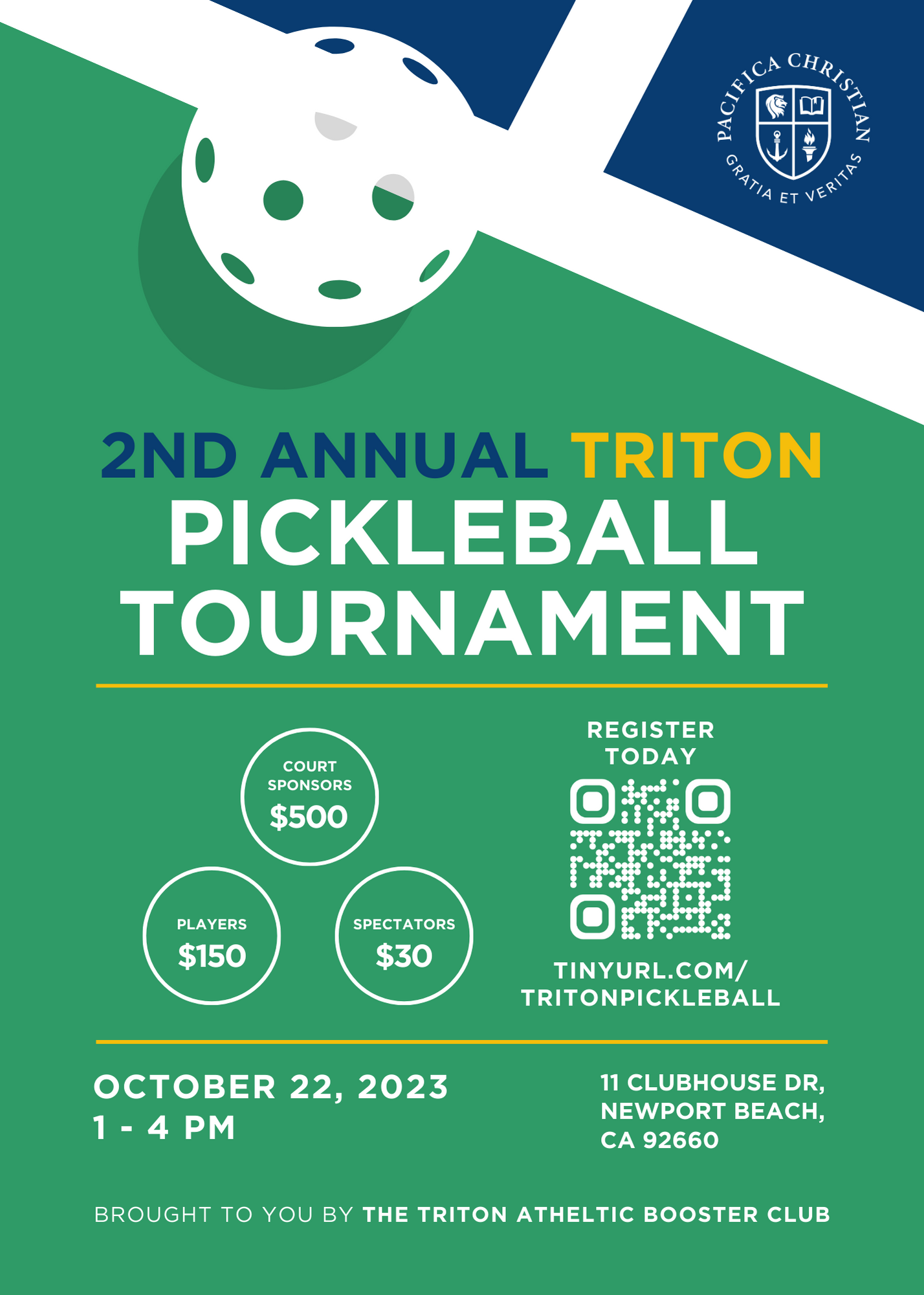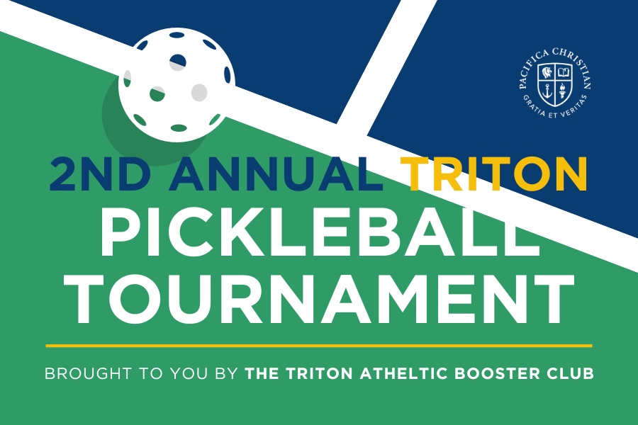 Join us for our 2nd Annual Triton Pickleball Tournament! Brought to you by The Triton Athletic Booster Club, the tournament will be held on October 22, 2023 from 1 - 4 PM. Proceeds from this event benefit The Triton Lab, a new facility that allows Pacifica Christian High School to increase enrollment to 385 students, includes a state-of-the-art sports performance and recovery center, and provides additional office space and parking.